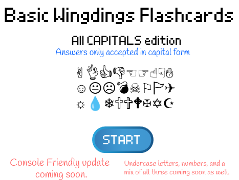 This is just a very (in development) basic wingdings (or gaster) font learner. Wingdings is not a language, but a font created in the 1990's but it can be treated as a code. Learning wingdings can be cool to understand gaster (character from undertale), playing games with wingdings as a code, or even confusing others when you replace your font with wingdings.